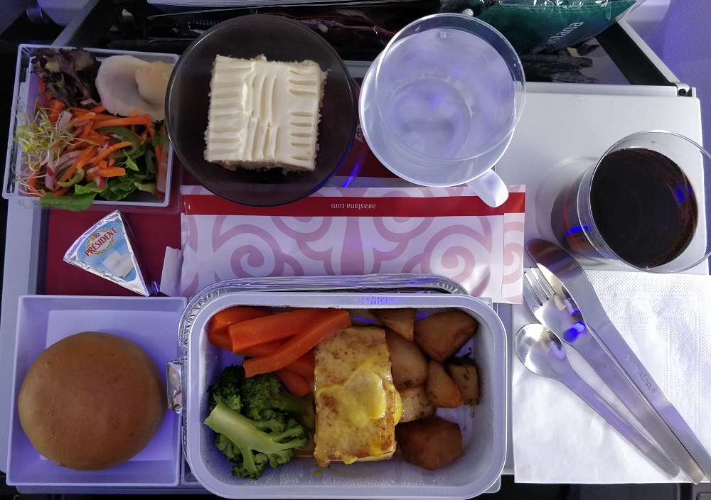 Vé máy bay tôi mua của hãng Air Astana giá là $830 khứ hồi mà dịch vụ thì quá là kinh khủng: máy bay nhỏ, ghế chật, không có màn hình giải trí (chỉ có tai nghe radio), chăm sóc khách hàng tại mặt đất siêu tệ. Điểm cộng sáng chói nhất là nhân viên phục vụ trên máy bay khá chu đáo, thức ăn máy bay khá ngon với các lựa chọn món Âu và món Á theo chuẩn Halal (không thịt heo), bia – rượu vang – champagne – nước ngọt – nước trái cây các thể loại free flow.